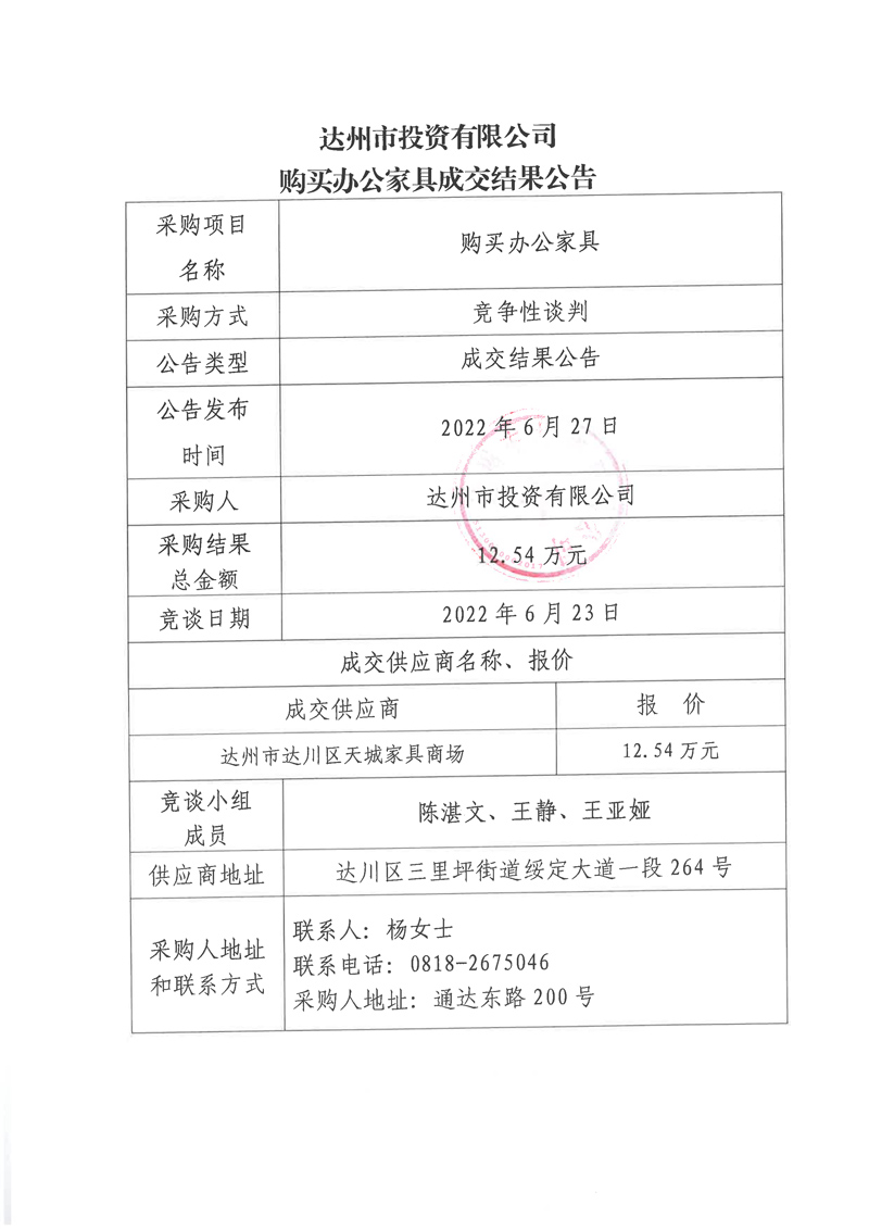 達州市投資有限公司購買辦公家具成交結果公告