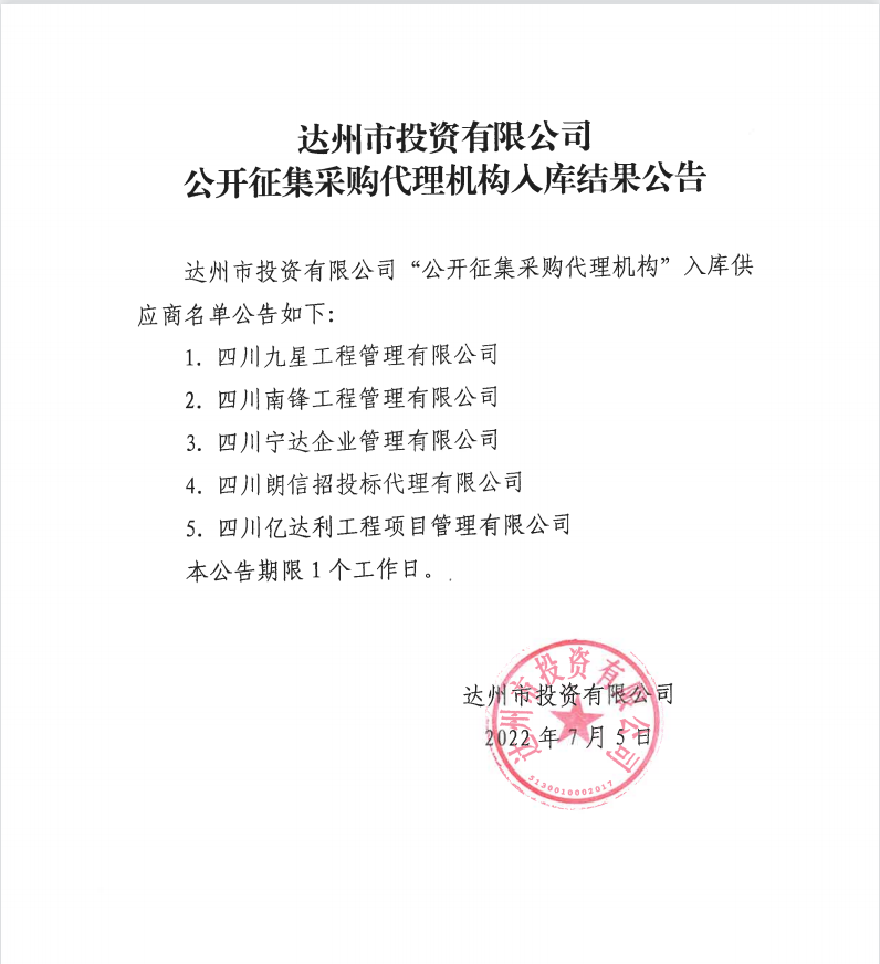 公開征集采購代理機構入庫結果公告