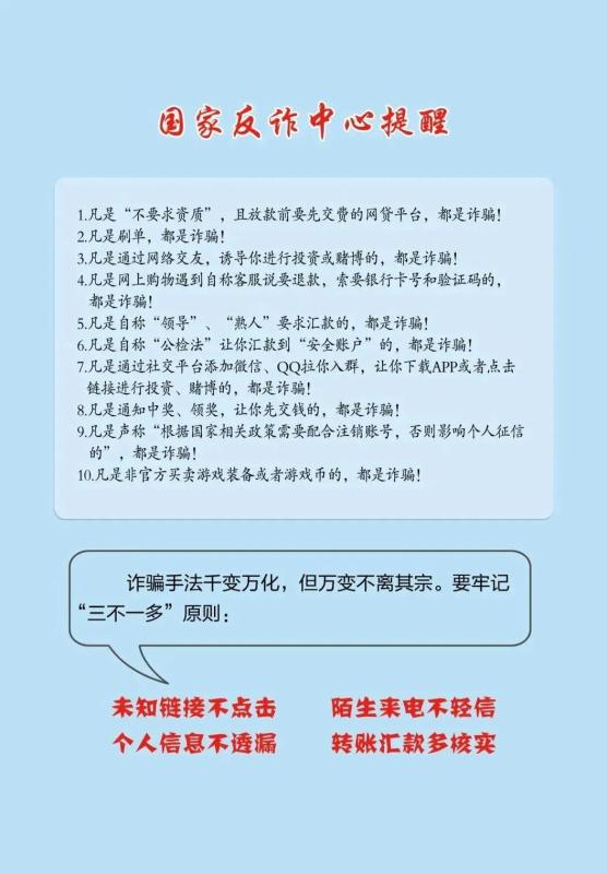 為進一步擴大反詐宣傳覆蓋面,提高廣大群眾防騙意識,國家反詐中心制作了《防范電信網絡詐騙宣傳手冊》,向廣大人民群眾介紹了十種常見的電信網絡詐騙類型,揭批了詐騙犯罪手法、文末有防騙神器,同時進行了防騙提示。